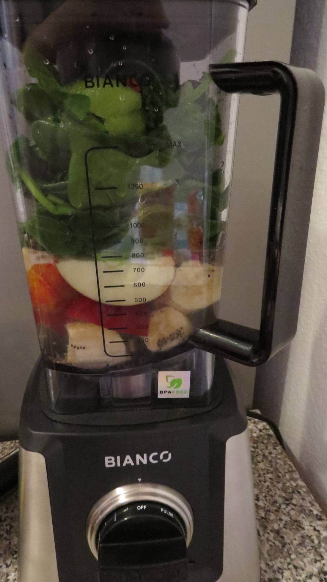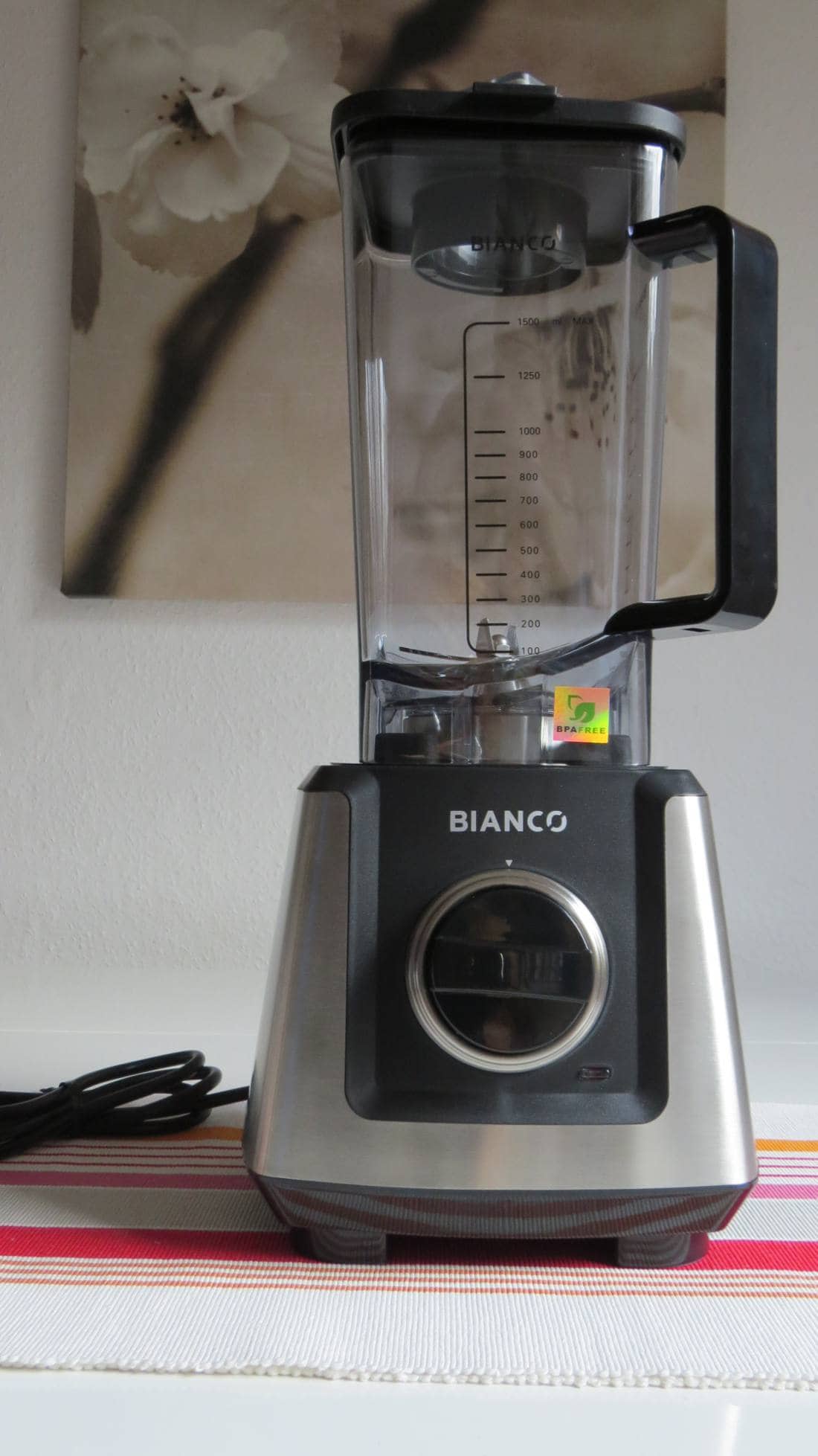 Mein Mixer ist dem Bianco primo sehr ähnlich. Diesen habe ich einmal bei einer Freundin gesehen und dann habe ich mir ihn sofort online von hier bestellt. Der Mixer ist in der gleichen Preis- und Leistungsklasse wie Bianco und aufgrund seiner Form kommt es manchmal vor, dass sich Nussstückchen unter den Messern verstecken und nur wenn ich ein bisschen Flüssigkeit dazu gebe, dann kommen sie raus. Das ist etwas, was bei vielen oder sogar bei allen anderen Geräten passiert, aber meine Freundin hat mich explizit darauf hingewiesen, dass so etwas vorkommen kann. Das ist für mich aber kein Problem, denn ich mache vorwiegend Smoothies oder Suppen mit dem Mixer und wenn ich Nüsse dazugebe, dann werden diese von meinem Mixer ohne Probleme zerkleinert.