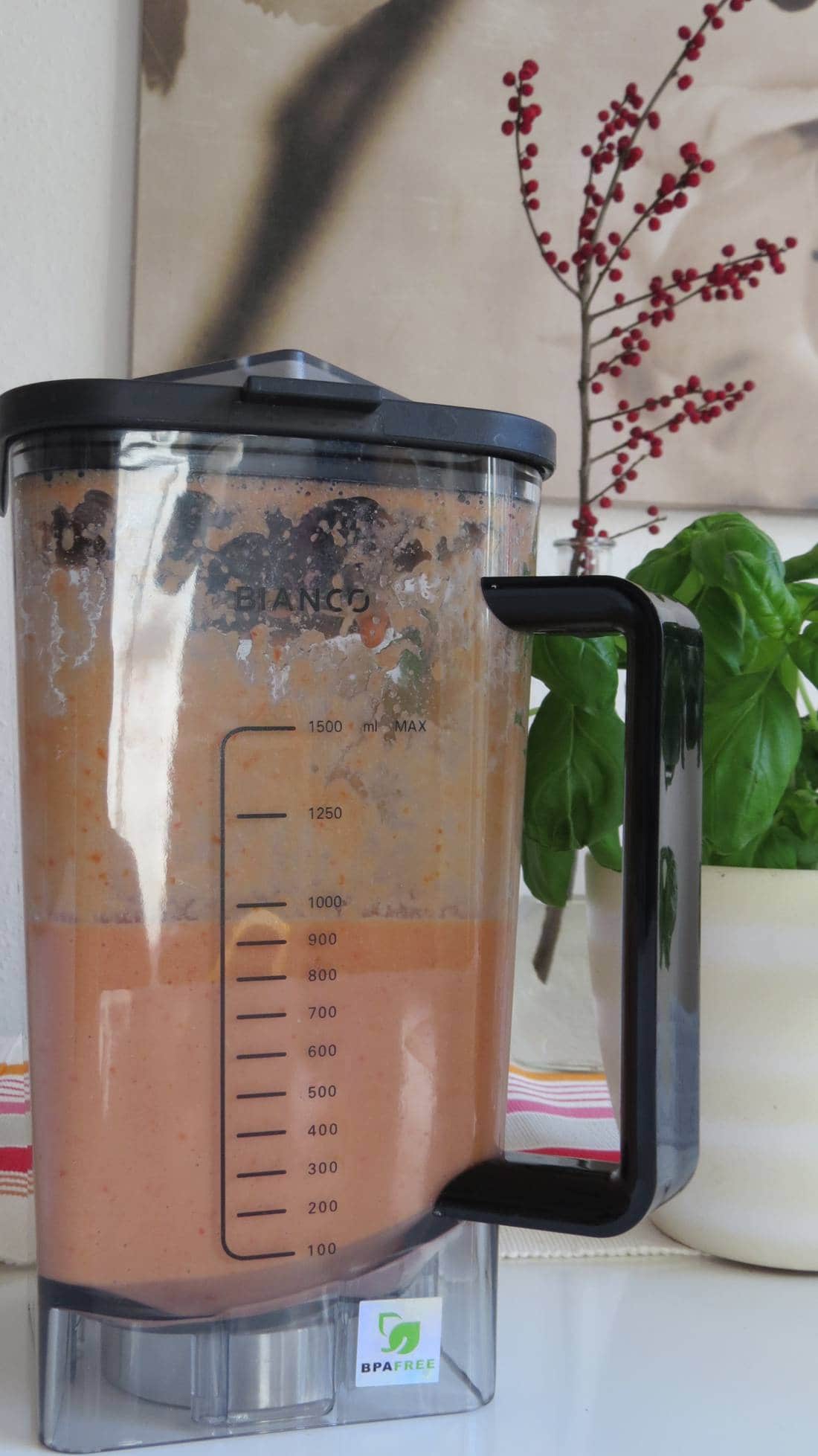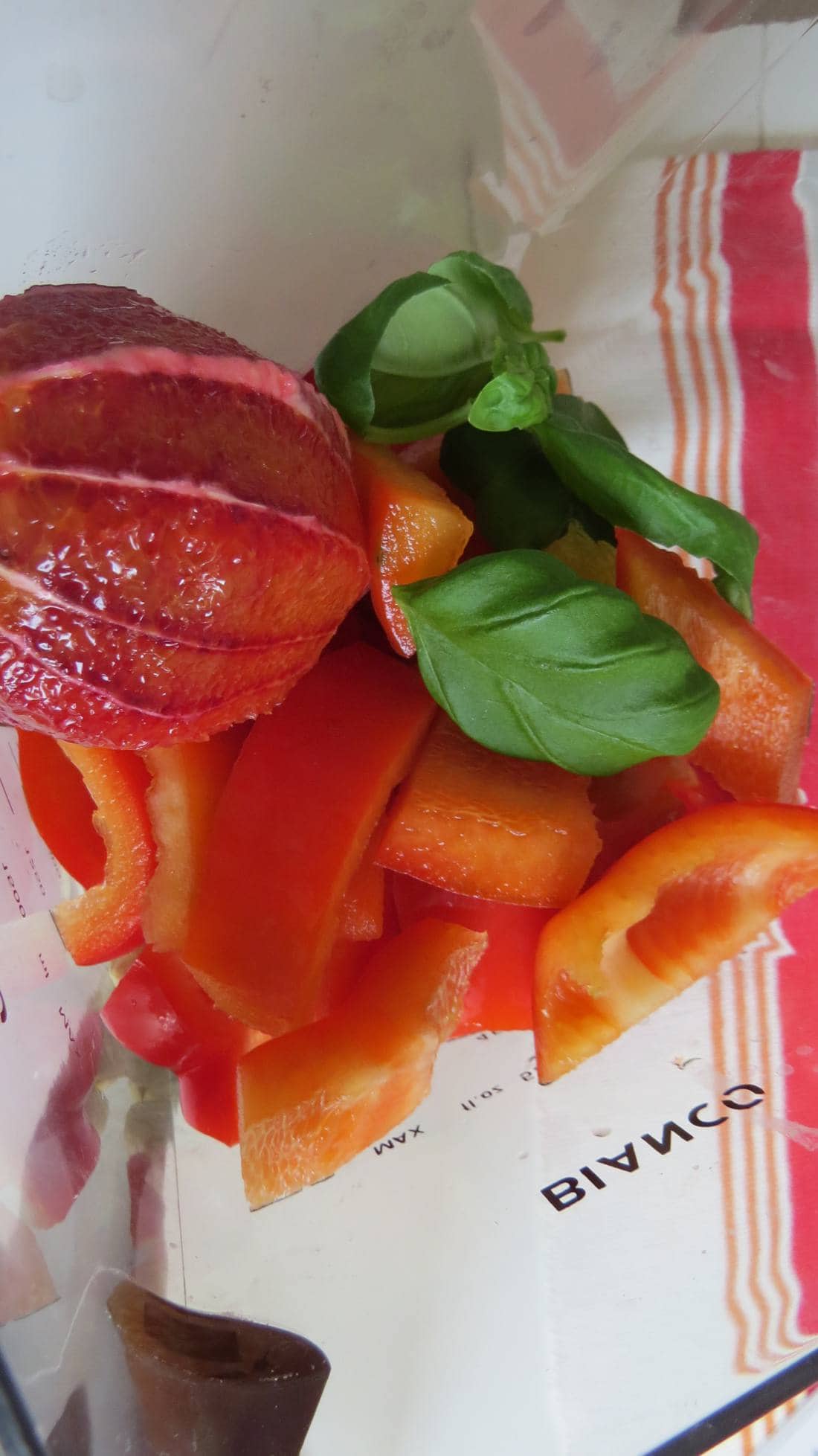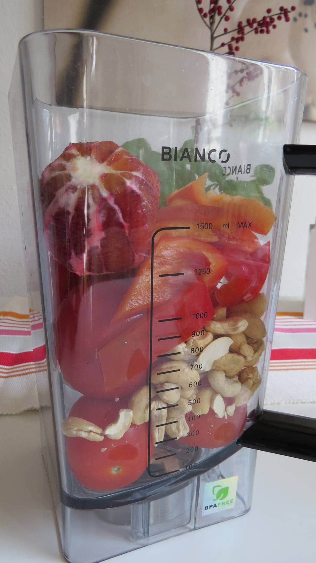 500 g Tomaten, 1 rote Paprika, 1 kleine Orange, 60 g Cashewkerne, 2-4 Basilikumblätter, Salz und Pfeffer. Alle Zutaten in den Mixer geben und circa eine Minute auf höchster Stufe mixen.