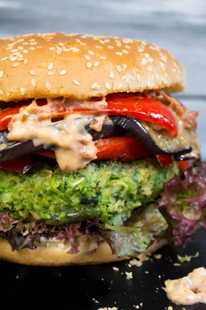 Ihr habt keine Lust auf Gemüse? Dann esst einfach diesen Green Monster Veggie Burger mit gegrillter Aubergine, roter Paprika und veganer Mayonnaise mit getrockneten Tomaten. Klingt vielleicht ein wenig verrückt, aber ihr werdet nicht glauben, wie viel Gemüse in dem Burger Patty ist. Ich wollte schon ewig mal einen komplett grünen Burger machen, der nur aus Gemüse besteht, aber meine Liste, auf der ich all meine Ideen für vegane Gerichte aufschreibe, wird immer länger und länger. So hat es dann doch relativ lange gedauert bis ich meine Idee endlich mal in die Tat umgesetzt habe. Wahrscheinlich könnte ich mich allein von den Gerichten, die auf meiner veganen Liste stehen mehrere Jahre ernähren. Schwer zu glauben, dass viele Leute immer noch denken vegane Ernährung sei langweilig und fad! ;-)