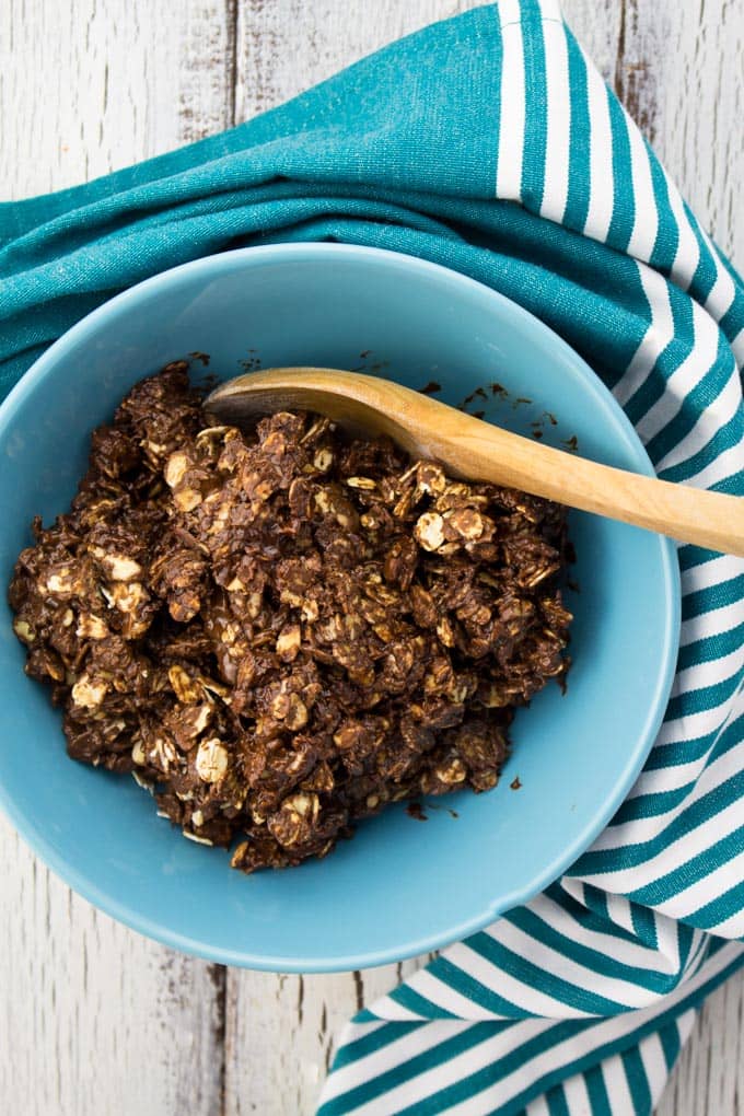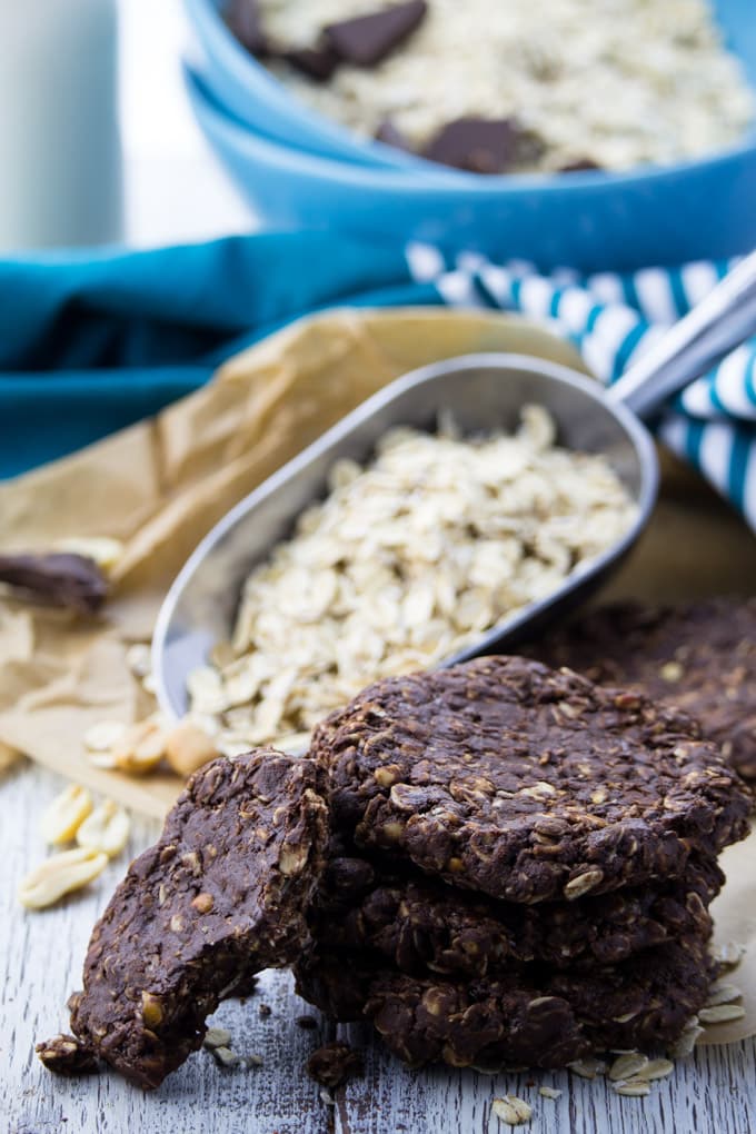 Das Beste an den no bake cookies ist, dass man nur vier Zutaten braucht: grobe Haferflocken, Zartbitterschokolade, Erdnbussbutter und etwas pflanzliche Milch. Ich habe Mandelmilch benutzt, aber natürlich klappen die Haferflocken Kekse auch mit jeder anderen Milch. Und gerade bei den heißen Temperaturen, die für nächste Woche gemeldet sind, lässt man ja auch mal ganz gerne den Backofen aus...