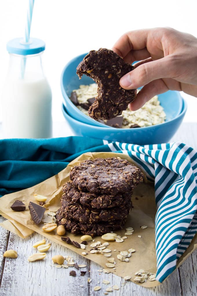 Ich habe so ein ähnliches Rezept mal während meiner Schulzeit in Kanada im Unterricht gemacht und das ist jetzt sozusagen die vegane Variante davon. Ich würde jetzt nicht so weit gehen und sagen, dass die no bake cookies mega gesund sind (obwohl es ja genug Studien gibt, die belegen, dass dunkle Schokolade wirklicht gut für die Gesundheit ist), aber sie sind auf jeden Fall deutlich besser als Schokokekse aus dem Supermarkt. Sie sind nicht nur vegan, sondern auch glutenfrei, ohne Öl und sie kommen ganz ohne zusätzlichen Zucker aus.