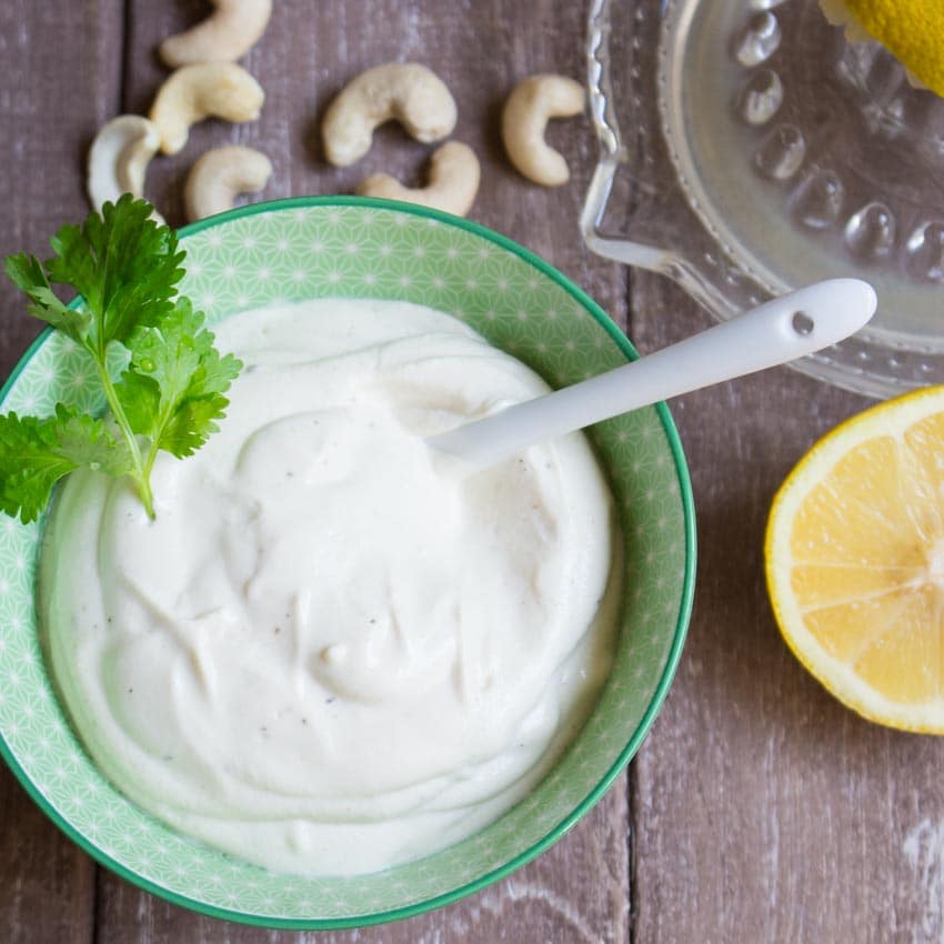 • Für die vegane Cashew Sour Cream alle Zutaten (Cashews vorher abgießen) in einen guten Mixer geben und zu einer glatten Masse verarbeiten. Mit Salz und Pfeffer würzen.