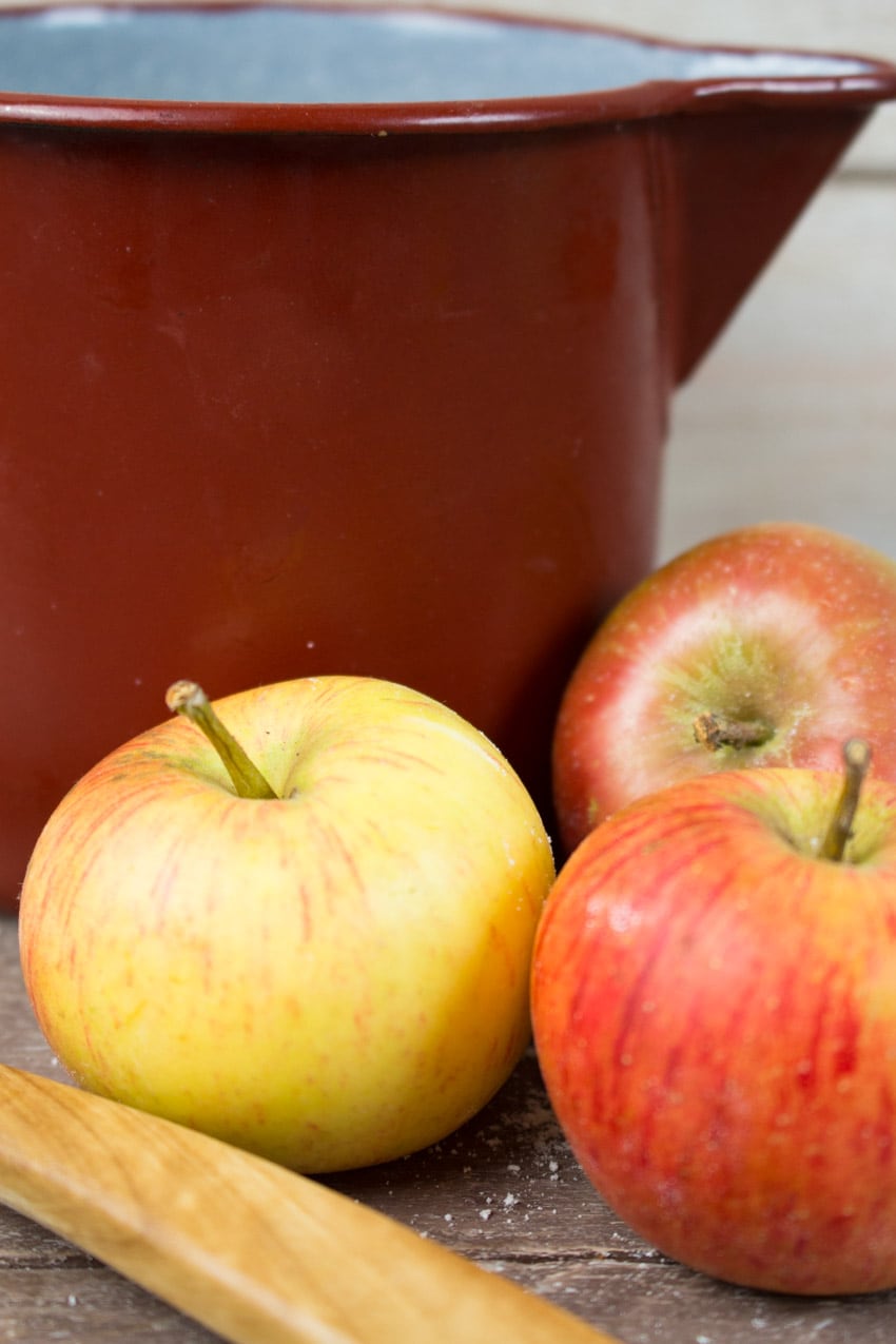 - In der Zwischenzeit die Füllung machen. Die Äpfel in kleine Würfel schneiden. In einer kleinen Pfanne einen Teelöffel Margarine erhitzen und die Äpfel darin anbraten. Mit einem halben Teelöffel Zimt bestreuen. Zur Seite stellen. Dann die restliche Margarine schmelzen.