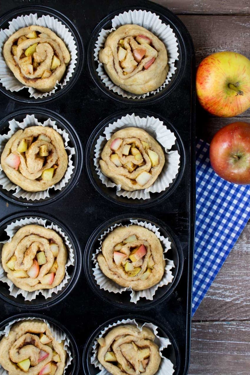 Den Teig ungefähr 30 Minuten gehen lassen. In der Zwischenzeit die Füllung vorbereiten. Hierzu die Äpfel in kleine Würfel schneiden und anbraten. Nochmals ein wenig Margarine schmelzen und damit den Teig bestreichen. Mit Zimt und Zucker bestreuen und die Apfelwürfel gleichmäßig darauf verteilen. Ich habe die Zimtschnecken in genau zwölf Teile geschnitten und habe sie in Muffinförmchen gebacken. Sie sind so nicht nur richtig lecker, sondern sehen auch noch echt süß aus. :-)