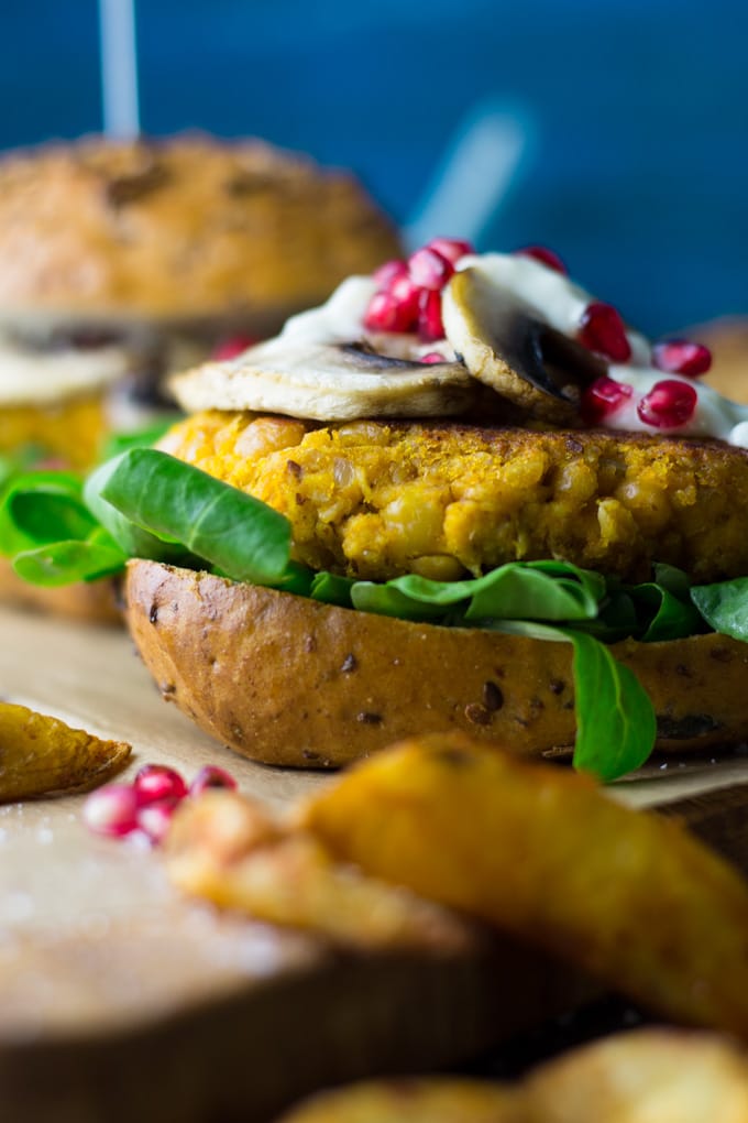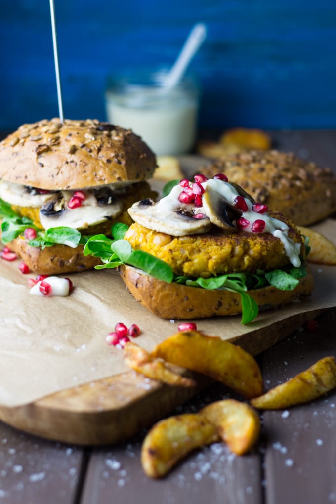 - Die gehackte Knoblauchzehe in die vegane Mayonnaise einrühren und die Burger Patties auf den Vollkornbrötchen mit dem Feldsalat, den gebratenen Champignons und den Granatapfelkernen anrichten. Mit etwas Knoblauch Mayonnaise und je nach Belieben mit Kartoffel Wedges servieren. Die Kürbis Burger schmecken auch kalt sehr gut.