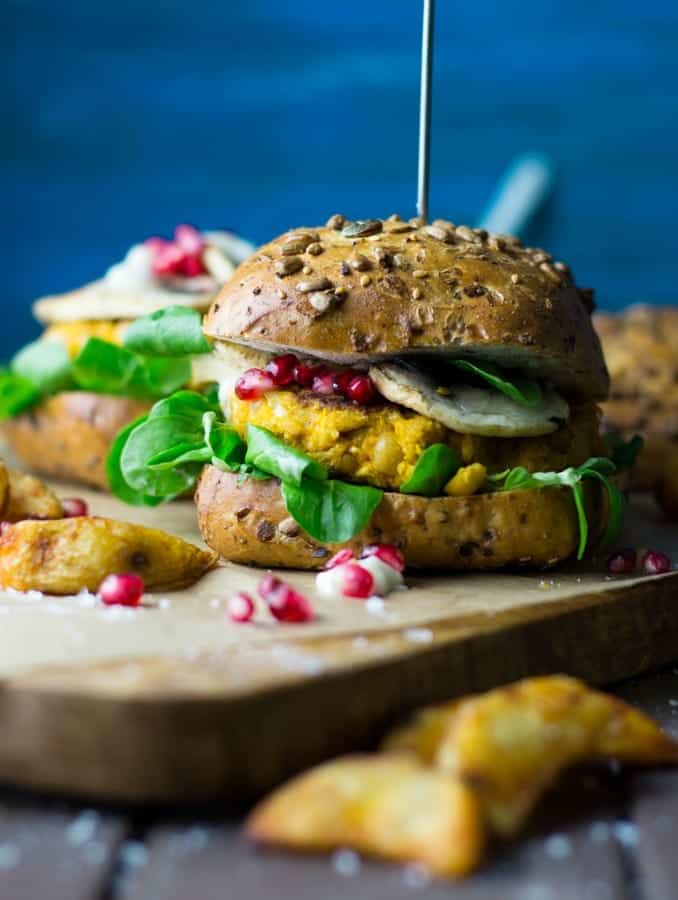 Ich bin letzte Woche aus Bali zurückgekommen und habe schon während ich dort war die ganzen Fotos von herbstlichen Gerichten bei Instagram gesehen. Wieder in Deutschland angekommen, war ich also in richtiger Herbst Stimmung. Mein erstes Herbstrezept dieses Jahr war ein Kürbis Smoothie und als nächstes gab es diese veganen Kürbis Burger mit Granatapfel, Feldsalat, Champignons und Knoblauch-Mayonnaise. Ein richtiger Herbst Burger sozusagen.