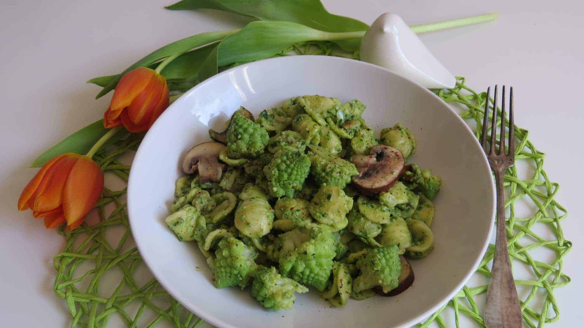 - Den Romanesco und die fertigen Nudeln zu den Pilzen in der Pfanne geben und alles gut mit dem Pesto vermischen.