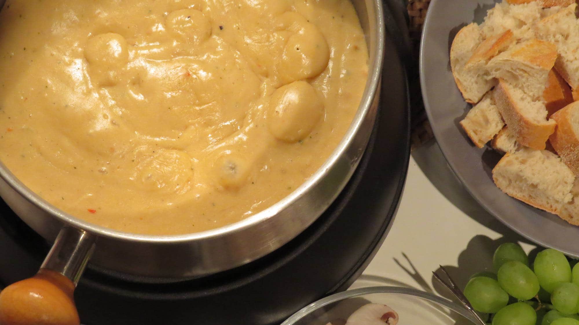 Mittlerweile habe ich allerdings gemerkt, dass nichts unmöglich ist und so haben wir am Wochenende mal wieder einen gemütlichen Fondue-Abend eingelegt. :-) Veganes Käsefondue ist also definitiv möglich und noch dazu ist es richtig lecker!! Neben Trauben, Champignons und Minikartoffeln gab es ganz traditionell Weißbrot zum Dippen.